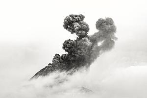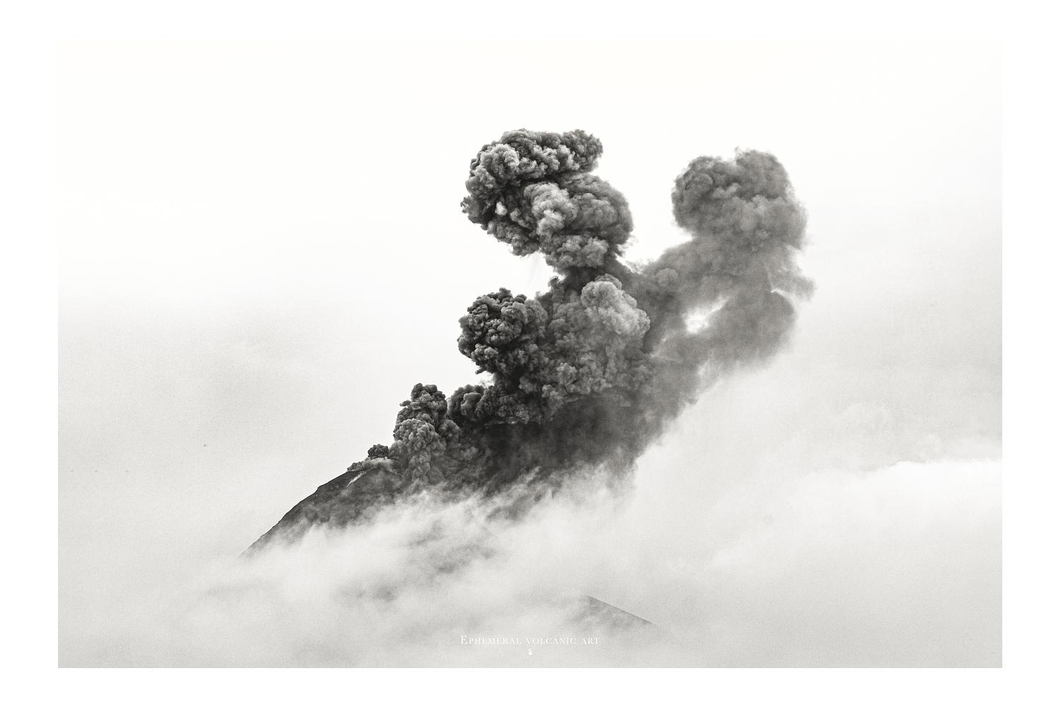 Photogenic volcanic plume after a beautiful strombolian eruption of the Fuego volcano, during a cloudy afternoon. Shot by Esteban Robles, from the Acatenango volcano in 2024 in Guatemala.